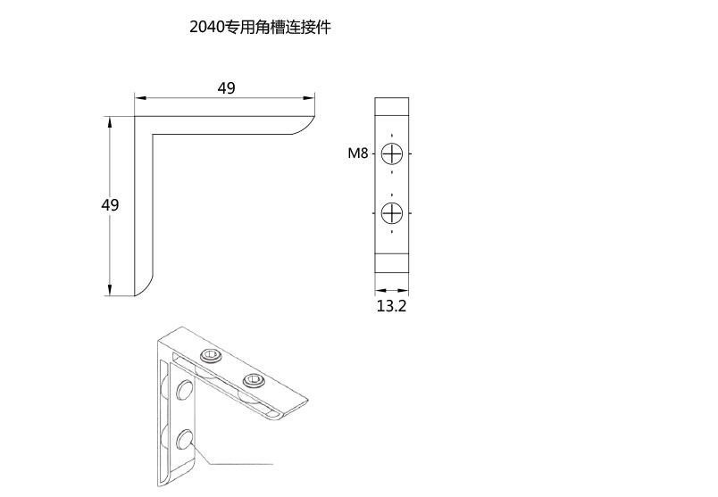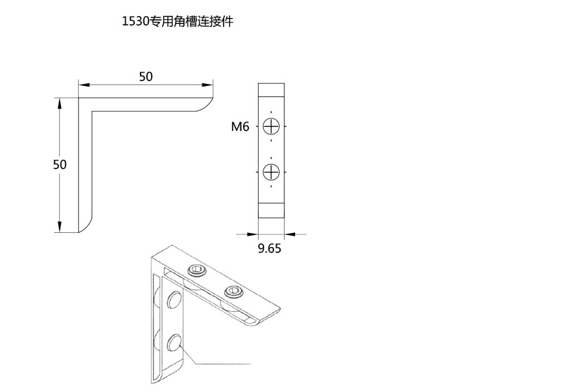 用于1530型材45度連接,安裝時將其兩端分別插入型材槽坑內,將緊固螺絲鎖緊。