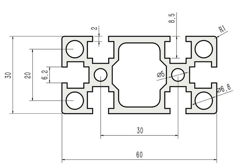 適用于應(yīng)力及強度較大的框架組合結(jié)構(gòu),它的外型采用直角過渡,表面經(jīng)過陽極氧化處理,高雅美觀并抗腐蝕,它通常采用M6X20高強度專用螺栓的內(nèi)部連接方式,堅固而又可靠,是工業(yè)框架應(yīng)用較為廣泛的型材之一。
